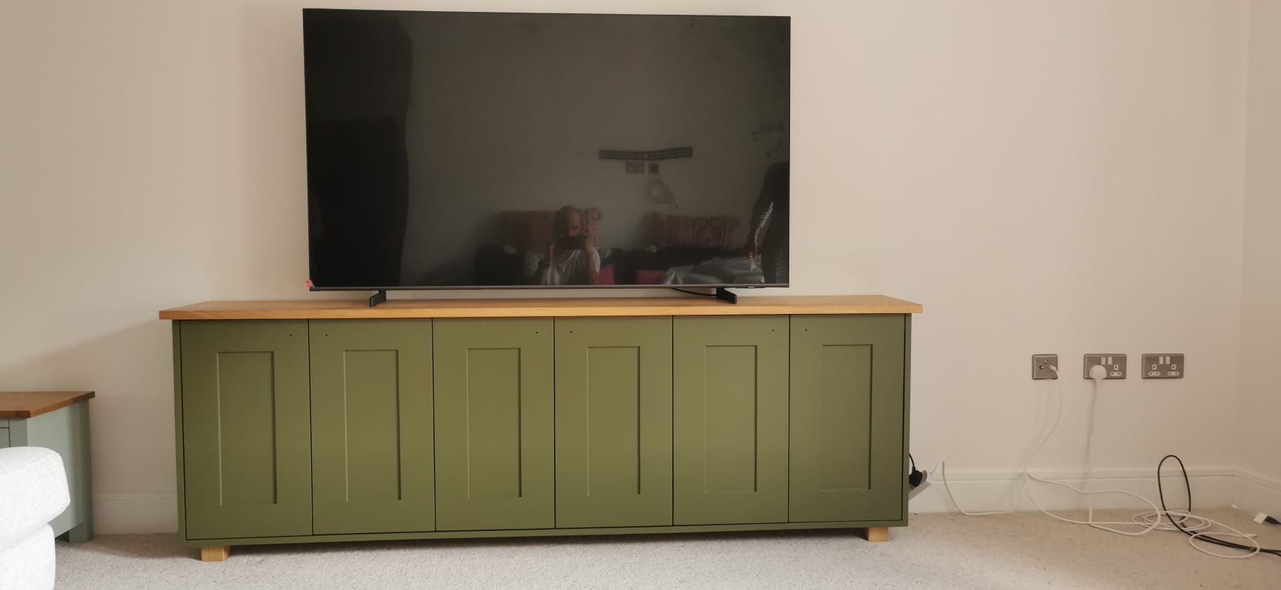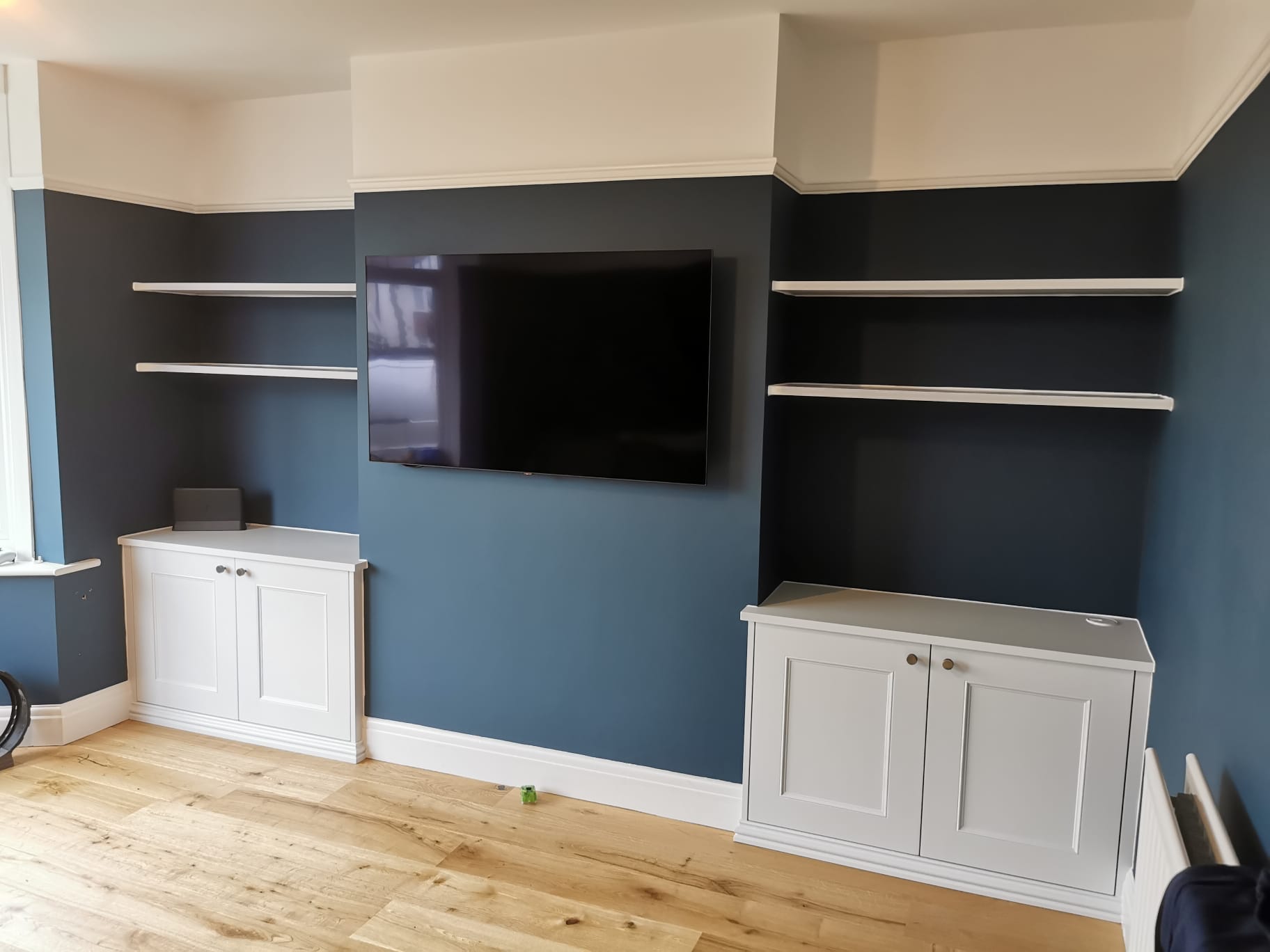 Knowing that no floors are perfect I spend a lot of time ensuring the cabinets are perfectly level across the room, and fixed firmly in place. Once I have achieved a level base the fitted cupboards are built up and topped with a cabinet worktop. The worktop will have a 80mm wooden cable tidy if required for lamps, TV’s and other electrical items.